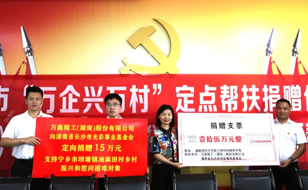 2022年7月,萬鑫精工向湖南省長沙市光彩事業基金會分兩次捐贈共計20萬元,用于定向幫扶寧鄉市壩塘鎮油麻田村鄉村振興、慰問困難對象和水利建設。去年全年,萬鑫精工已通過各種渠道和形式,累計向社會捐助善款和物資總價值達117萬元,以實際行動,發揮民企力量參與到寧鄉鄉村建設中。